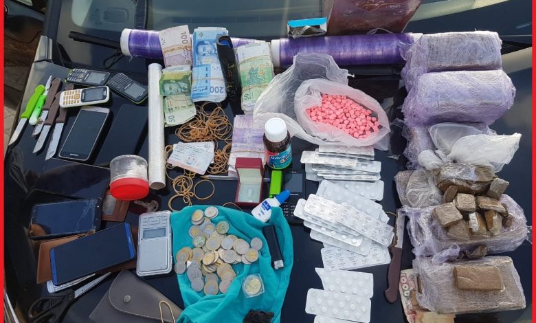 وقد جرى توقيف المشتبه فيهم بمحطة الأداء بالطريق السيار بمدخل مدينة الجديدة مباشرة بعد وصولهم على متن سيارة خفيفة، حيث أسفرت عملية التفتيش المنجزة عن العثور بحوزتهم على 630 قرص مخدر وأربع كيلوغرامات من مخدر الشيرا وجرعات من مخدر الكوكايين، علاوة على كيلوغرامين من مادة “المعسل” وبخاخ غاز مسيل للدموع وسبعة أسلحة بيضاء ومبلغ مالي يشتبه في كونه من عائدات هذا النشاط الإجرامي.