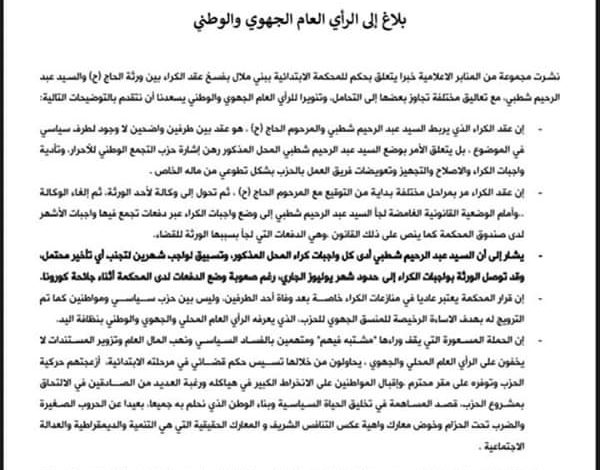 الأحرار بجهة بني ملال خنيفرة يصدرون بيانا حول مآل مقر الحزب.