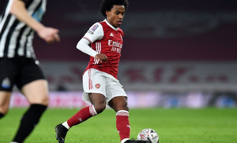 Arsenal's Brazilian midfielder Willian controls the ball during the English FA Cup third round football match between Arsenal and Newcastle United at the Emirates Stadium in London on January 9, 2021. (Photo by Glyn KIRK / AFP) / RESTRICTED TO EDITORIAL USE. No use with unauthorized audio, video, data, fixture lists, club/league logos or 'live' services. Online in-match use limited to 120 images. An additional 40 images may be used in extra time. No video emulation. Social media in-match use limited to 120 images. An additional 40 images may be used in extra time. No use in betting publications, games or single club/league/player publications. / (Photo by GLYN KIRK/AFP via Getty Images)