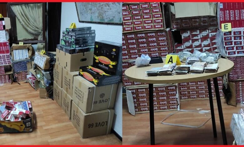وقد مكنت هذه العملية الأمنية التي جرى تنفيذها بمنزل بالحي الحسني بمدينة وجدة من ضبط المشتبه فيهما، فيما مكنت عمليات التفتيش بهذا المنزل ومرآب متصل به من حجز 8800 علبة من السجائر المهربة من مختلف الأنواع، بالإضافة إلى 440 علبة من مادة “المعسل” و100 علبة من ورق تلفيف السجائر و1080 علبة أخرى من مادة “الكربون” التي تستعمل في إشعال “الشيشة” ومبلغ مالي مهم يشتبه في كونه من متحصلات هذا النشاط الإجرامي.