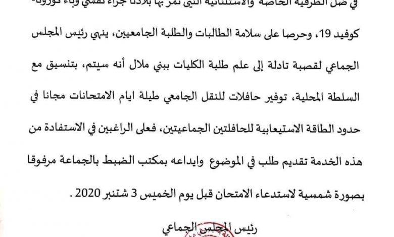 المجلس البلدي لقصبة تادلة وبتعاون مع السلطة المحلية يوفر حافلات مجانا لنقل طلبة الجامعة طيلة أيام الامتحانات.