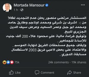 وقال رئيس الزمالك في تدوينة على حسابه الرسمي بموقع التواصل الاجتماعي “فيس بوك”، إنه غض الطرف عن تجديد عقدي المغربيين أشرف بن شرقي ومحمد أوناجم، مباشرة بعد نهاية مباراة الفريق أمام الوداد دوري الأبطال عشية اليوم، والتي خسرها بنتيجة (1-0).