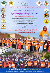 فتحت شعار “الرياضة النسوية رافعة للتنمية” وبدعم من الجماعة الترابية لقصبة تادلة و بتنسيق مع المديرية الإقليمية لوزارة التربية الوطنية و التعليم الأولي و الرياضة و المندوبية الجهوية للجمعية المغربية للصحافة الرياضية، ستحتضن مدينة قصبة تادلة يوم الاحد 27مارس2022، فعاليات هذه التظاهرة الرياضية النسوية، المنظمة من قبل نادي السنبلة لألعاب القوى، فيدرالية الفجر للتنمية المستدامة، جمعية المدينة العتيقة للتنمية و الثقافة، جمعية نزعة خير للأعمال الاجتماعية و التنمية المستدامة، جمعية سهام الخير لمناهضة العنف، نادي تادلة للرياضات الجبلية، مؤسسة عمر بن الخطاب للتعليم الخصوصي، فيدرالية أمهات وآباء التلاميذ دائرة قصبة تادلة.