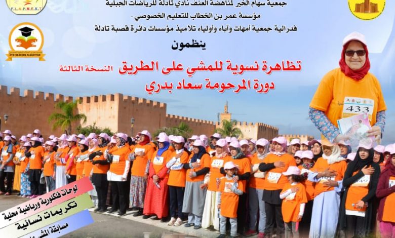 بعد توقف اضطراري بسبب جائحة كورونا، قررت عدة مكونات من النسيج الجمعوي بمدينة قصبة تادلة، تنظيم النسخة الثالثة للتظاهرة النسوية للمشي على الطريق، المندرجة في سياق الاحتفاء باليوم العالمي للمرأة، و تكريما لروح الفاعلة الجمعوية سعاد بدري شملها الله برحمته الواسعة.