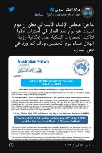 ونشر مجلس الإفتاء الأسترالي، اليوم الأربعاء، تغريدة على حسابه في “تويتر“، يعلن فيها أن يوم السبت المقبل الموافق 22 أبريل، هو يوم عيد الفطر في أستراليا.