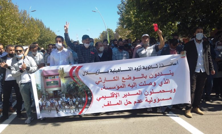 نظم العشرات من أستاذات وأساتذة ثانوية أزود التأهيلية بأزيلال، الثلاثاء، مسيرة إحتجاجية، انتهت بوقفة أمام مقر المديرية الإقليمية لوزارة التربية الوطنية، تنديدا بالوضع الكارثي الذي تعرفه المؤسسة، وتنفيذا للبرنامج النضالي للمكتب الإقليمي للتنسيقية الوطنية للأساتذة الذين فرض عليهم التعاقد.