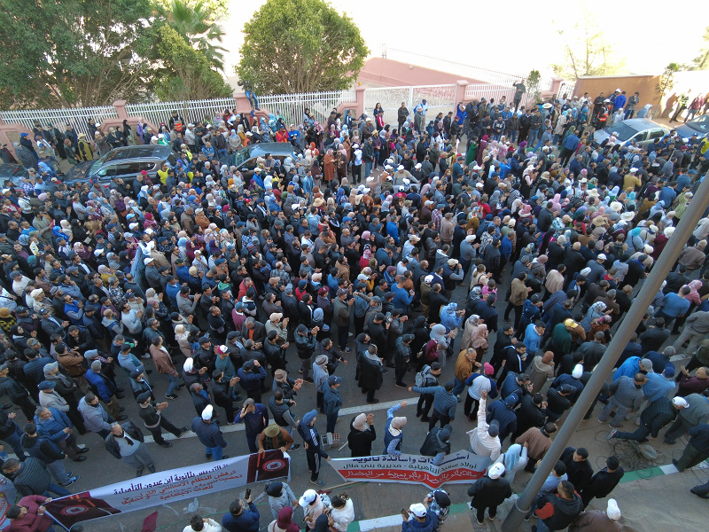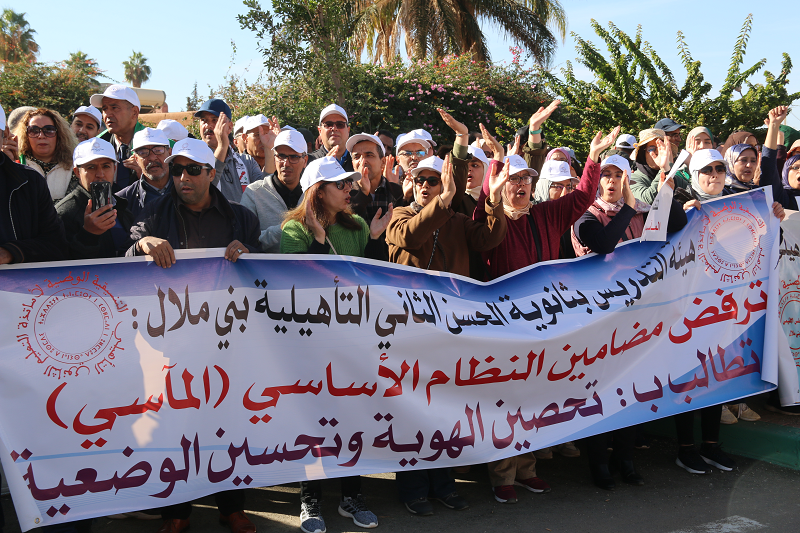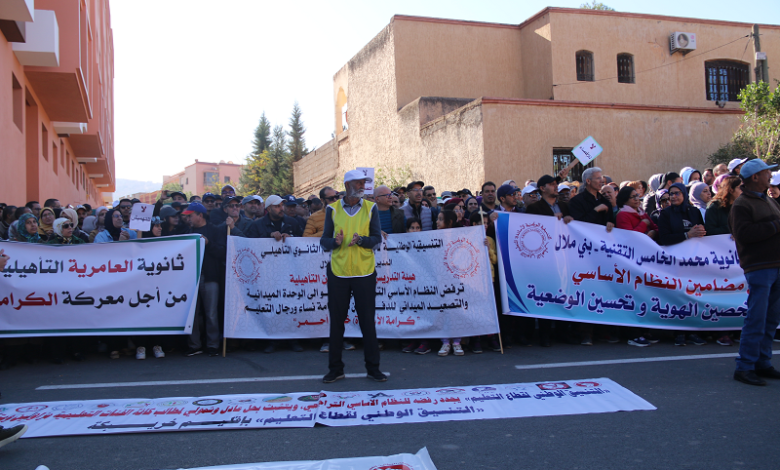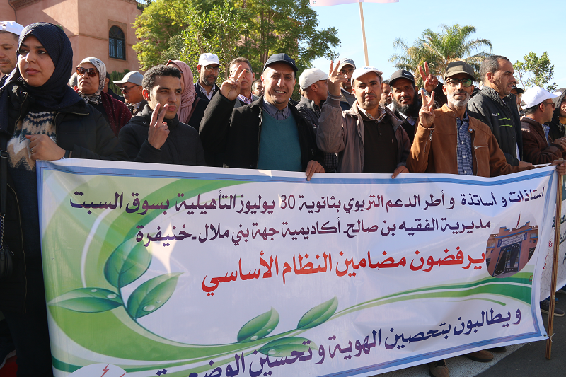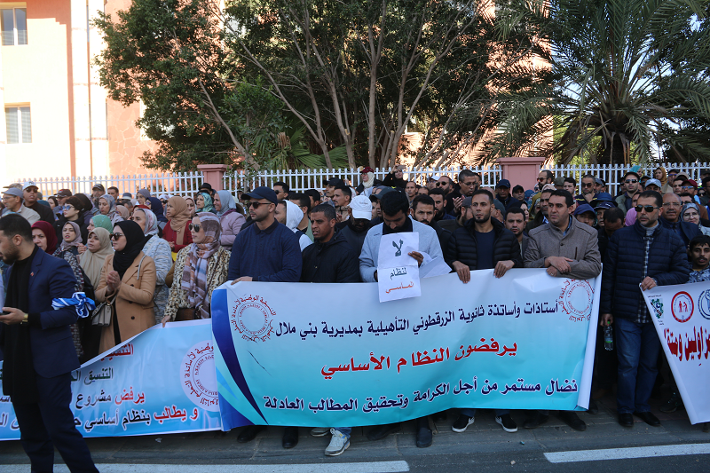 نظم، اليوم الأربعاء، المئات من الأستاذات والأساتذة، مسيرة قطبية بمدينة بني ملال، احتجاجا على النظام الأساسي الجديد، وتنديدا بما اعتبروه محاكمات صورية في حق الأساتذة، ورفضا لمخرجات الإجتماع الذي جمع رئيس الحكومة مع النقابات التعليمية الأكثر تمثيلية في لقاء الاثنين المنصرم.