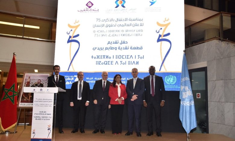 من جهته، أكد المدير العام لبريد المغرب، أمين بنجلون التويمي، أن “هذا الطابع البريدي المميز، الذي تم إعداده بالتعاون مع المجلس الوطني لحقوق الإنسان و مركز الأمم المتحدة للإعلام بالرباط، يجسد الهوية البصرية للذكرى الـ 75 للإعلان العالمي لحقوق الإنسان، و يبرز كونية حقوق الإنسان”، موضحا أنه تم إنجازه على أساس داعم لاصق شفاف، “في سابقة في مجال الطوابع البريدية”.