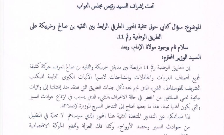 طالب البرلماني عبد الهادي شريكة عن فريق الأصالة والمعاصرة بإقليم الفقيه بن صالح في سؤال كتابي وجهه لوزير والتجهيز والنقل بتثنية المحور الطرقي الرابط بين الفقيه بن صالح وخريبكة على الطريق الوطنية رقم 11 . نظرا للحركة الكثيفة لجميع أصناف الحافلات والشاحنات وآليات الكبرى التابعة للمجمع الشريف للفوسفاط .