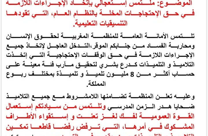 التمست الأمانة العامة للمنظمة المغربية لحقوق الإنسان ومحاربة الفساد من وزير الداخلية اتخاذ الإجراءات اللازمة في حق الإحتجاجات المخلة بالنظام العام، التي تقودها التنسيقيات التعليمية.