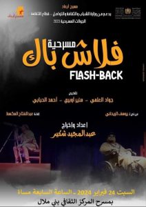 تعرض دار الثقافة بمدينة بني ملال يوم السبت 24 فبراير 2024 على الساعة السابعة مساء، العرض المسرحي “فلاش باك” لفرقة مسرح أبعاد من الدار البيضاء، إعداد و إخراج: عبد المجيد شكير، عن نص ليوسف الريحاني، تشخيص: جواد العلمي، منير أوبري و أحمد الحبابي.