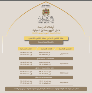 كشفت وزارة التربية الوطنية و التعليم الأولي و الرياضة، مساء أمس السبت (09 مارس الجاري)، عن أوقات الدراسة خلال شهر رمضان لسنة 1445 هجرية، برسم الموسم الدراسي 2024/2023.