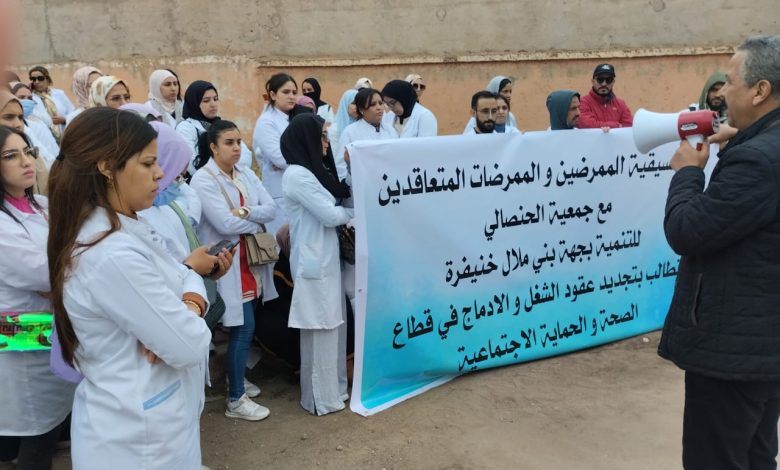 رفع المحتجون لافتات و شعارات تابعة لـ “تنسيقية الممرضين المتعاقدين مع جمعية الحنصالي للتنمية”، تطالب بالإستمرار في تشغيلهم و دمجهم في القطاع الصحي العام، يأتي ذلك بعد الجهود الكبيرة التي بذلوها لخدمة القطاع الصحي في جهة بني ملال – خنيفرة منذ عام 2020، خلال فترة الصحة العامة الحرجة خلال جائحة كوفيد-19.