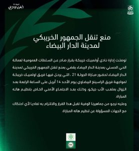 من جهتها، دعت إدارة نادي أولمبيك خريبكة في بلاغ لها عبر صفحتها الرسمية بموقع التواصل الإجتماعي “فايسبوك”، أنصار و محبي فريق أولمبيك خريبكة، الوفية تقبل هذا القرار و الإلتزام به تفادياً لأي إحتكاك مع الجهات المسؤولة عن تنظيم هاته المباراة.