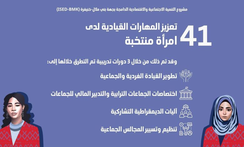 وتحقيقاً لهذه الغاية، قام المشروع بتطوير و تنفيذ برنامج لتنمية القيادة الجماعية و الفردية لفائدة 40 إمرأة منتخبة بجهة بني ملال خنيفرة، بهدف تعزيز مشاركتهن في عملية صنع القرار، و تسهيل أداء أدوارهن كمنتخبات و المساهمة في إعمال الادماج السوسيو إقتصادي للفئات الهشة.