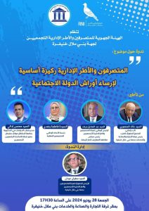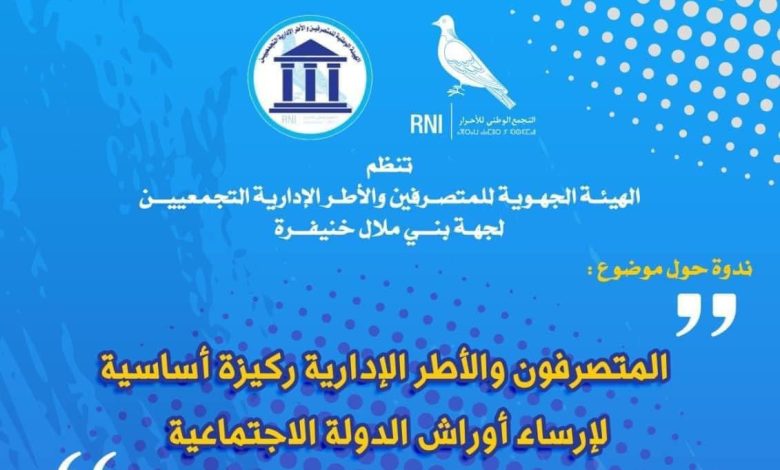 تنظم الهيئة الجهوية للمتصرفين و الأطر الإدارية للتجمعيين لجهة بني ملال خنيفرة بمقر غرفة التجارة و الصناعة و الخدمات ببني ملال خنيفرة يوم الجمعة 28 يونيو 2024 على الساعة 17h30، ندوة تدور أحداثها حول موضوع “المتصرفون و الأطر الإدارية ركيزة أساسية لإرساء أوراش الدولة الإجتماعية”.