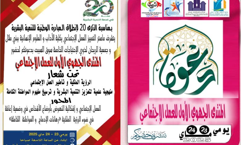 بمناسبة الذكرى العشرين لانطلاق المبادرة الوطنية للتنمية البشرية، تحتضن مدينة سوق السبت، يومي 23 و24 ماي الجاري، فعاليات المنتدى الجهوي الأول للعمل الاجتماعي، المنظم تحت شعار: “الرؤية الملكية وتأطير العمل الاجتماعي: منهجية علمية لتعزيز التنمية البشرية وترسيخ مفهوم المواطنة الكاملة.”