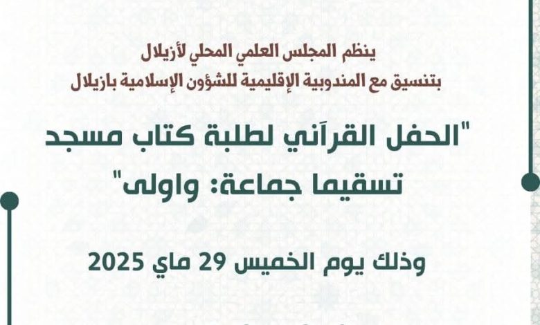 يستعد المجلس العلمي المحلي لأزيلال، بتنسيق مع المندوبية الإقليمية للشؤون الإسلامية، لإقامة الحفل القرآني السنوي لطلبة كتاب مسجد تسقيما بجماعة واولى، وذلك يوم غد الخميس 29 ماي 2025، في مناسبة دينية وثقافية يهدف من خلالها إلى تكريم المتفوقين وتعزيز القيم القرآنية في صفوف الناشئة.