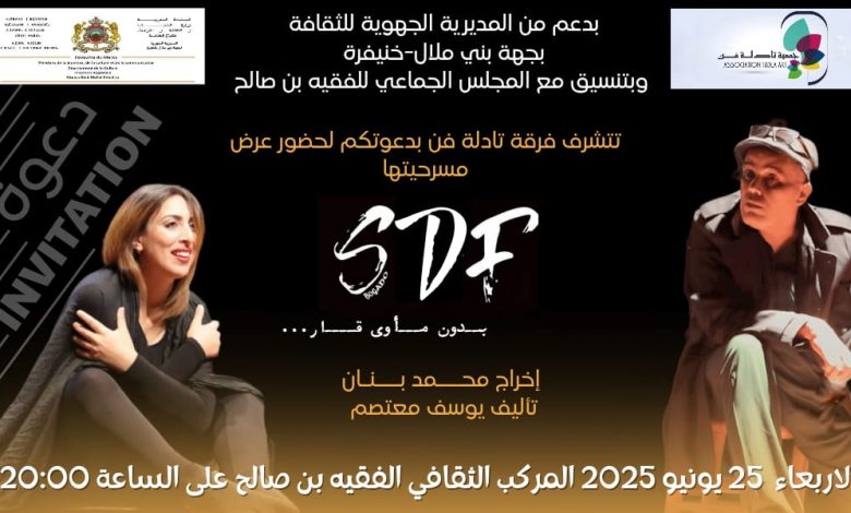 تستعد فرقة “تادلة فن” لتقديم مسرحيتها الجديدة “SDF… بدون مأوى قار”، يوم الأربعاء 25 يونيو 2025، على الساعة الثامنة مساء بقاعة المركب الثقافي بمدينة الفقيه بن صالح، في عرض ينتظره جمهور المسرح بالجهة، بدعم من المديرية الجهوية للثقافة بجهة بني ملال-خنيفرة وبتنسيق مع المجلس الجماعي للمدينة.