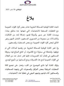 وفي الوقت الذي تُسجّل فيه النقابة رفضها القاطع لهذه الممارسات، فإنها تُثمن تدخل عدد من عناصر القوات العمومية الذين تحلّوا بالحكمة و ساهموا في تهدئة الوضع، و منع تصعيد السلوكيات غير المهنية التي من شأنها المساس بحرية العمل الصحفي في الفضاء العام.