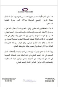 وأوضحت النقابة أنها تتابع الموضوع عن كثب، و تعمل على تجميع كافة المعطيات المرتبطة بالعراقيل التي واجهها الصحافيون و الصحافيات أثناء تأدية واجبهم المهني، مشيرة إلى أنها بصدد إعداد تقرير مفصل حول هذه الانتهاكات، سيتم نشره فور استكمال عملية التوثيق و التدقيق.