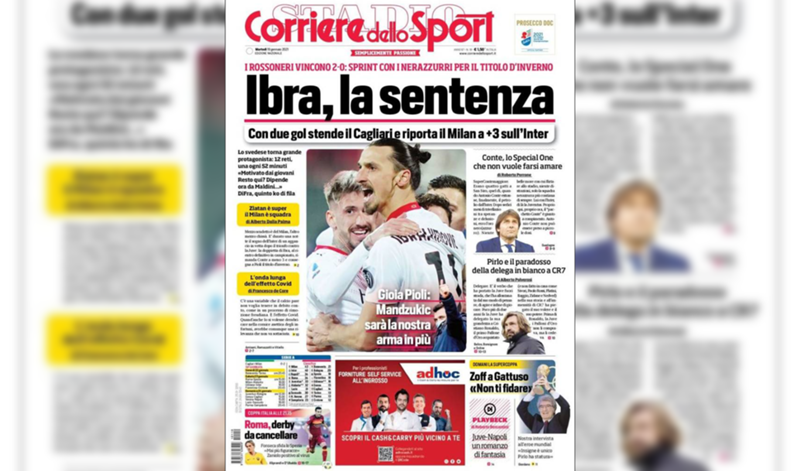 الصحيفة ركزت على الأداء الرائع لزلاتان إبراهيموفيتش نجم ميلان مساء الأمس في مواجهة فريق كالياري ضمن لقاءات الجولة الـ 18 من الدوري الإيطالي وتسجيله لهدفين.