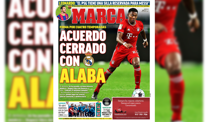 الصحيفة كشفت عن بنود اتفاق ريال مدريد مع دافيد ألابا لاعب بايرن ميونخ الذي سيخضع للكشف الطبي وينضم للفريق مجانًا في يناير.