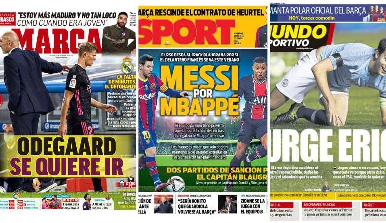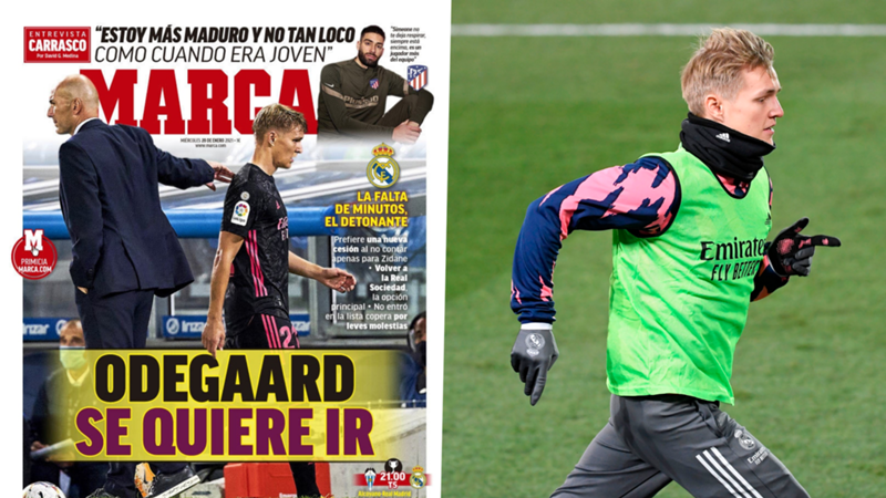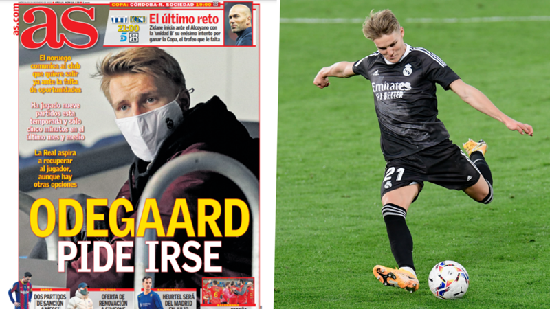 الغلاف الرئيسي للصحيفة الإسبانية، كان عن أزمة صانع الألعاب النرويجي مارتين أوديجارد، ورغبته في الرحيل عن ريال مدريد بعد استبعاده من مباراة الكأس.
