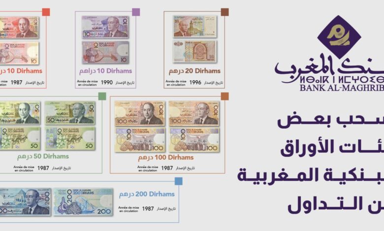 وأوضح البلاغ أن القرار يشمل أوراق 10 و50 و100 و200 درهم الصادرة سنة 1987، إضافة إلى أوراق 10 دراهم الصادرة سنة 1990، وأوراق 20 درهمًا الصادرة سنة 1996، والتي ستفقد صفة التداول القانوني والقوة الإبرائية ابتداءً من التاريخ المذكور.