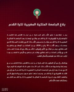 قررت الجامعة الملكية المغربية لكرة القدم التقدم باستئناف رسمي ضد الأحكام الصادرة عن لجنة الانضباط التابعة للكونفدرالية الإفريقية لكرة القدم (الكاف)، وذلك حرصاً منها على صون كافة الحقوق القانونية التي يكفلها القانون الوطني والدولي.