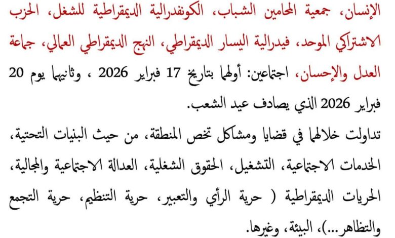 وأكدت الهيئات الموقعة أن تأسيس هذا الإطار يأتي في سياق “التعاطي الجاد والمسؤول” مع الإشكالات المطروحة، وتوحيد الجهود للدفاع عن الحق في التنمية بالمنطقة، عبر تنسيق المبادرات والمواقف، وصياغة برامج عمل مشتركة للترافع حول الملفات ذات الأولوية.