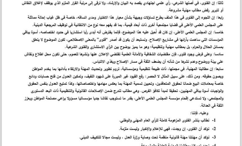 كما دعا البيان إلى نشر الفتاوى المشار إليها بشكل كامل للرأي العام المهني والوطني، من أجل توضيح مضمونها وسياقها، وتفادي ما وصفه بسوء الفهم الذي قد ينشأ عن تداول مقتطفات غير مكتملة منها، مؤكداً أن الشفافية في هذا الإطار من شأنها دعم النقاش العمومي المسؤول وتعزيز الثقة في مسار الإصلاح الجاري.