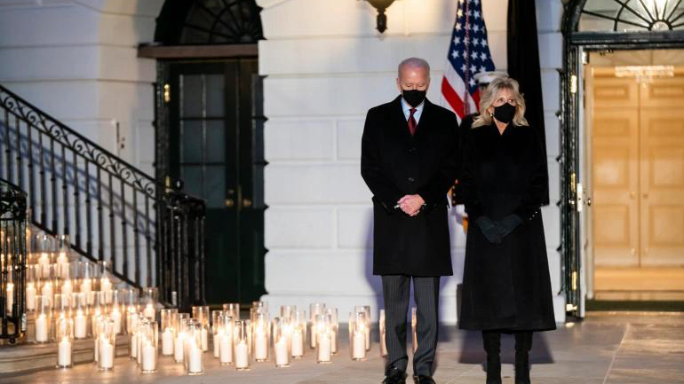 وبعدما ألقى الرئيس بايدن خطابه خرج رفقة زوجته جيل ونائبته كامالا هاريس وزوجها دوغ إيمهوف إلى الحديقة الجنوبية للبيت الأبيض، حيث وقفوا دقيقة صمت حدادا على الأرواح التي أزهقها الفيروس، والتي تمثلت بـ 500 شمعة أضيئت خلفهم.