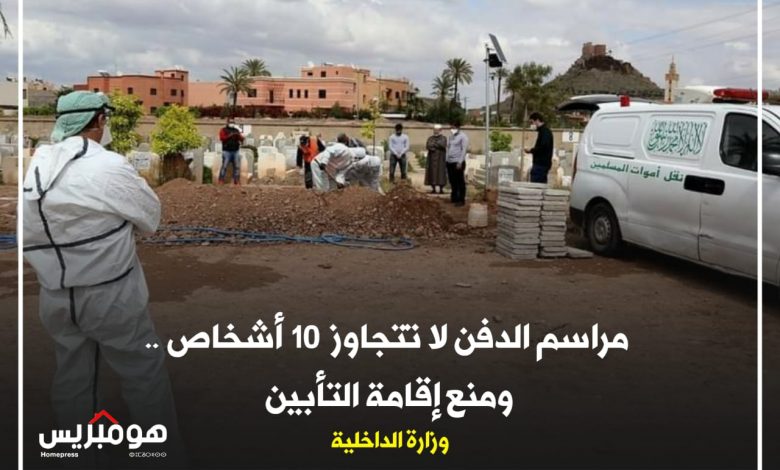 الرباط – أكدت وزارة الداخلية على ضرورة مواصلة التقيد بالإجراءات المعلن عنها سابقا فيما يخص عدم تجاوز 10 أشخاص، كحد أقصى، في مراسم الدفن، ومنع إقامة مراسم التأبين، وذلك في إطار التدابير الاحترازية المعمول بها للحد من انتشار وباء كورونا المستجد، وحفاظا على صحة المواطنات والمواطنين.